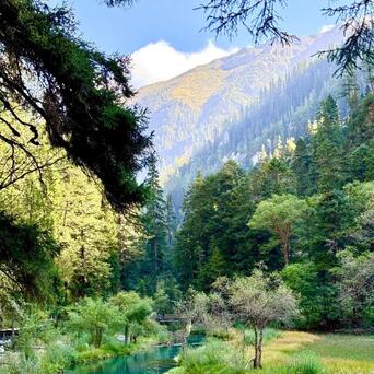 九寨沟的水,清澈得能看见水底的石头和游鱼。秋天的时候,树叶变得五彩斑斓,倒映在水里,美得不要不要的。这里就像是大自然的调色盘,四季都有不同的色彩。